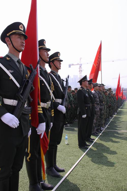 上午10時,點驗大會在嘹亮的軍歌聲中拉開序幕。預(yù)備役官兵軍容嚴(yán)整,雄姿勃發(fā),精神抖擻,士氣高昂,充分展示了當(dāng)代預(yù)備役軍人的良好精神風(fēng)貌,展現(xiàn)了部隊良好的軍政素質(zhì)和優(yōu)良的戰(zhàn)斗作風(fēng)。3名儀仗隊員護衛(wèi)著軍旗,邁著矯健的步伐從主席臺南側(cè)走到隊列北側(cè)。1500余人的預(yù)備役軍人身著整齊的軍裝,按照各自編制,在操場排成整齊的方隊,接受了首長的檢驗并進行了宣誓儀式。點驗結(jié)束后,預(yù)備役官兵進行了擒敵拳、盾牌警棍術(shù)和防爆隊形等三個科目的匯報演示。通過集結(jié)點驗,鍛煉提高了團首長機關(guān)和營連各級指揮員的組織協(xié)調(diào)能力,探索研究了組織全團集結(jié)點驗的方法路子,錘煉了部隊,強化了作風(fēng),有效提高了部隊快速動員和隨時應(yīng)召的能力。